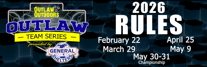 38. Outlaw Of The Year: A Team must enter three (3) of the four (4) regular season Tournaments plus The Championship to be eligible for Outlaw Of The Year. Tournament Director may allow substitutions should extenuating circumstances arise (death, military deployment, etc). Points will be awarded with 1st place in each tournament receiving 300 points, 2nd place receiving 299 points, etc. Teams that do not weigh in will each receive 20 points less than the last place Team that weighed in at that Tournament. Points earned at The Championship will be calculated the same as regular season tournaments AND DOUBLED. Should there be a tie in points at the end of the season for Outlaw Of The Year, the team having weighed in the heaviest stringer of the series (Tournaments 1-4) will be declared Outlaw Of The Year.