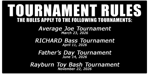 - Off-Limits Areas: Teams may not fish inside any areas designated as “off-limits” or “no fishing” by State or Federal Officials. There are no other off-limits areas for the Tournament.
